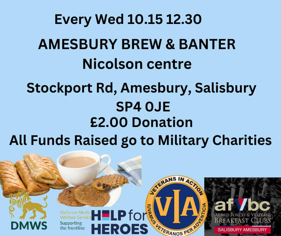 Brew & Banter (Amesbury)by Phil28/07/202304/03/2024 Come and join us for brew and some good banter at the Nicholson centre every Wednesday from 10 o’clock. For a small donation of £2 you can sample some excellent homemade backed goodies and bottomless brews. All proceeds go to Military Charities